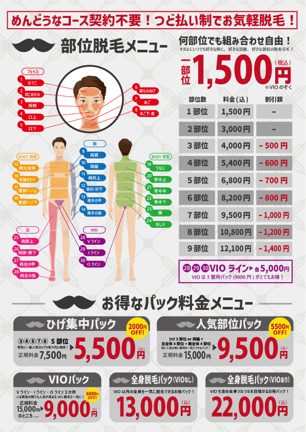 1部位1,500円から、高額・面倒なローン契約も一切無し!気になる部位だけお好きな回数脱毛出来る男性専用脱毛サロンを栃木県宇都宮市にオープンさせます!