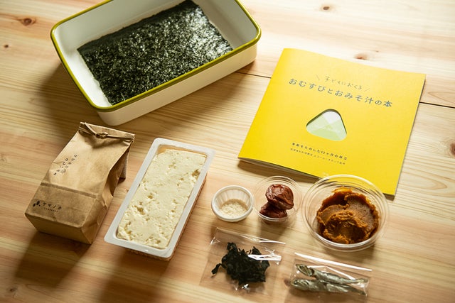 本の中のレシピにある「うめぼしのおむすび」おむすび4個「とうふとわかめのおみそ汁」みそ汁4人前が作れる分量がセットになっています。