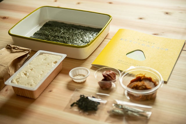 本の中のレシピにある「うめぼしのおむすび」おむすび4個「とうふとわかめのおみそ汁」みそ汁4人前が作れる分量が5セット届くセットになっています。
