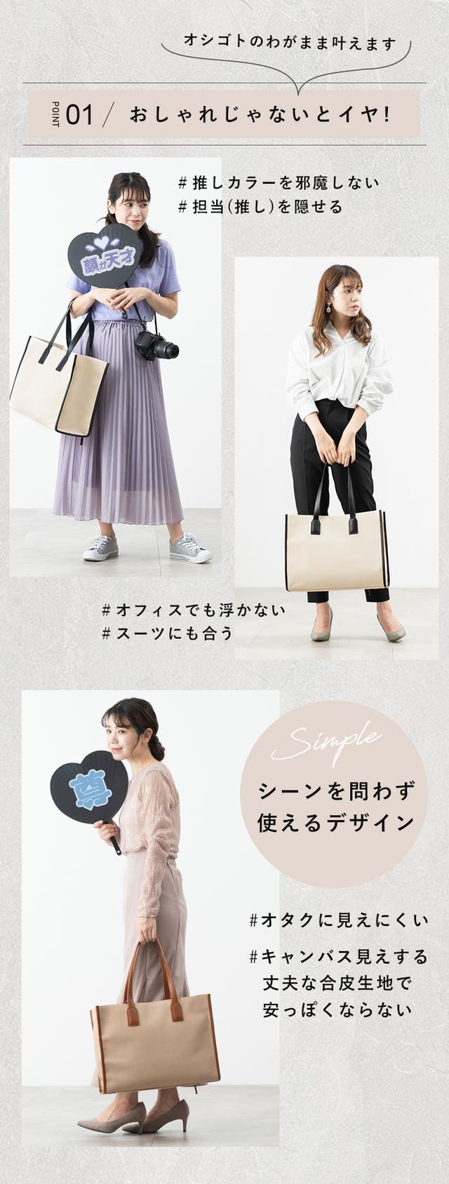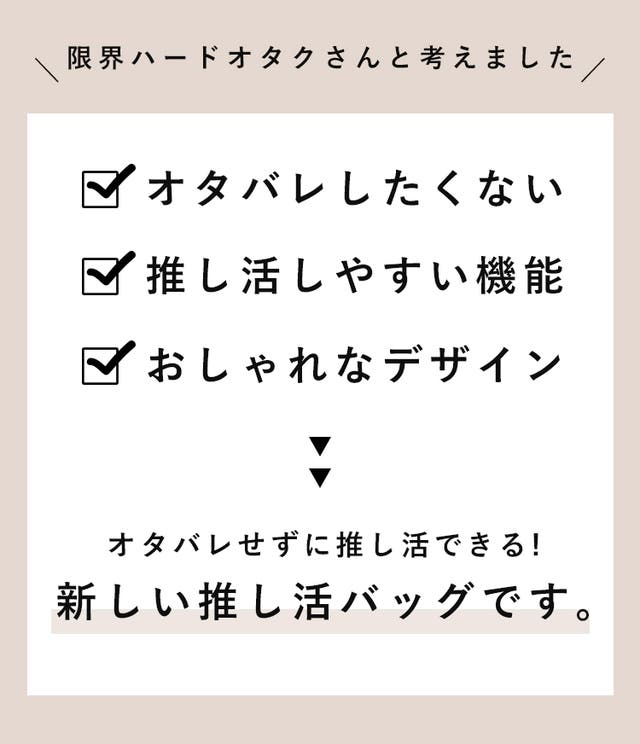 - オタ活しやすい機能性でありながら、シンプルな見た目でシーンを選ばず使える!