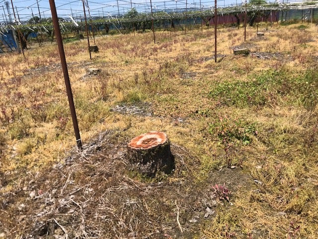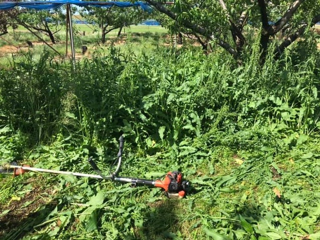 草の根は地中深くまで伸びます。草の根が土を耕してふかふかにします。このことは桃の樹の環境にとても大切です。