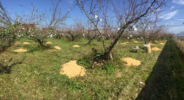 毎年コシヒカリ栽培から出たもみ殻を桃畑にまきます。