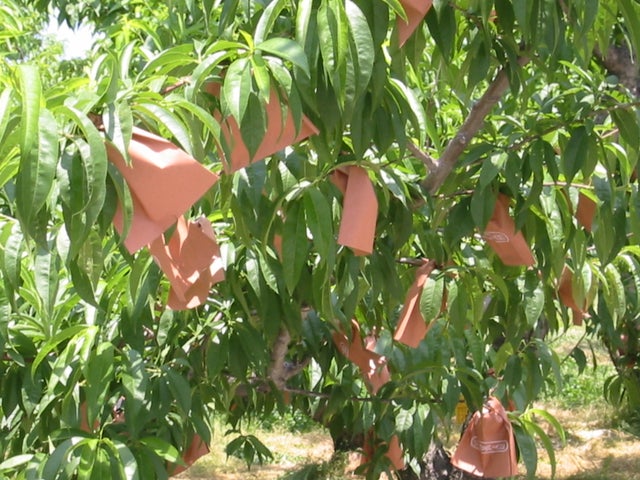 桃っ子一つ一つに丁寧に袋をかけます。袋に保護されながら大きくなり、収穫の二週間くらい前に袋を取ります。