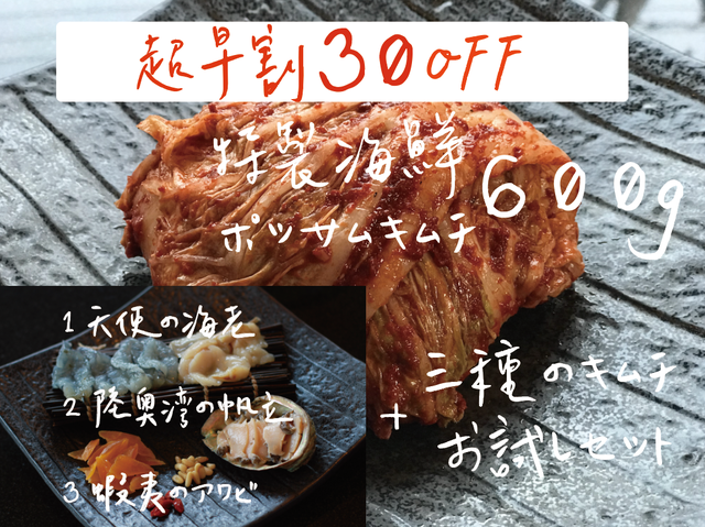 超早割 海鮮キムチ600g&キムチ3種お試しセット さきイカキムチ付き