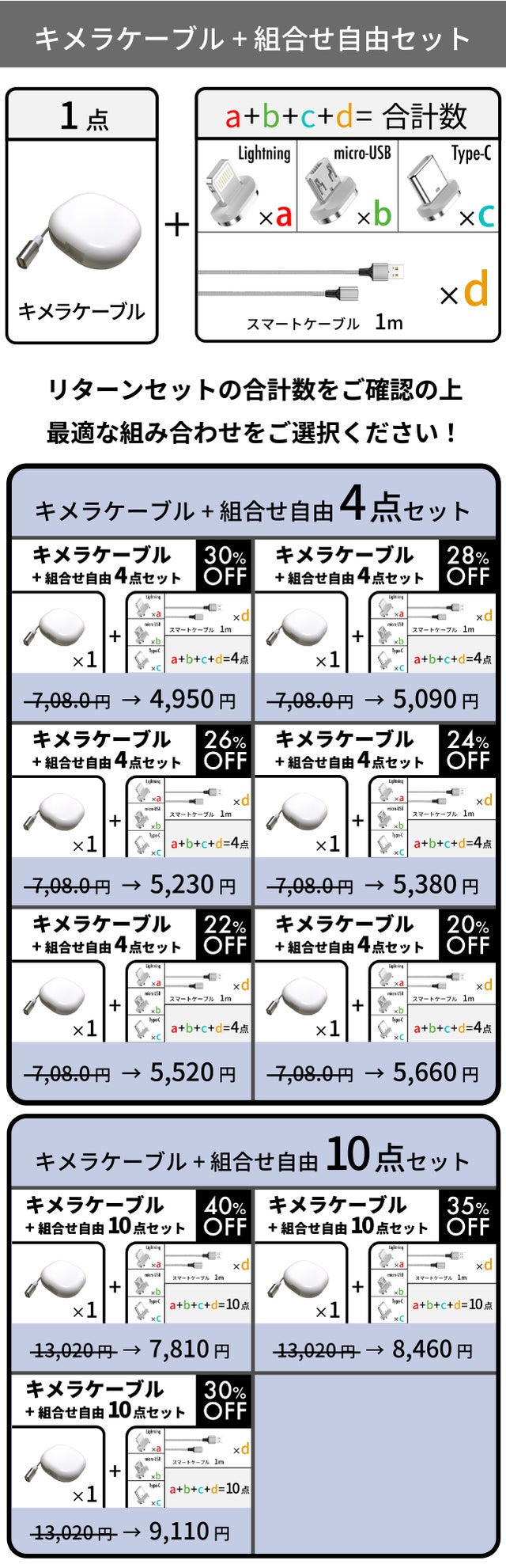 ・スマートケーブル(1.0m)、Lightning 端子、Micro-USB 端子、Type-C 端子の中からお好きな組み合わせで合計10点お選びいただけます。