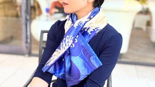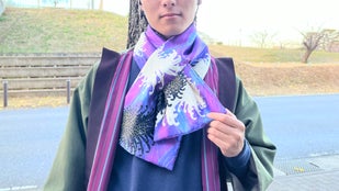 着物が持つ東洋の美しさを洋服にも気軽に取り込めたら、さらに生活が華やかに、そして楽しくなっていくと思っております。こちらのシルクマフラーは差し込むだけで、すぐに形が整うので、そこから先はコーディネートに専念できます。また、シルクの輝きをジュエリー感覚で身につけることもおすすできるところです。