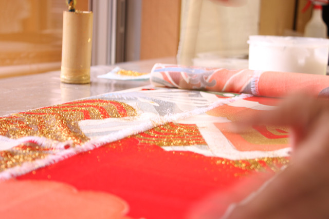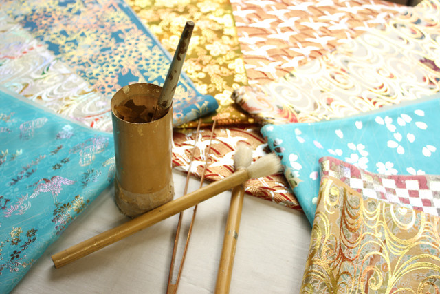 私どもがしている金彩加工は、布地(着物地)を対象に主に箔や金属粉などを糊で接着加工する技術です。