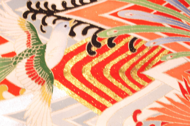 金や銀といった箔、金属粉などを着物に接着加工する技術の総称です。刺繍などと共に着物の総仕上げの役割を担います。