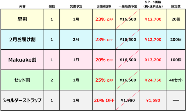 ※皆様の応援購入により量産効率が向上した場合、正規販売価格が予定価格より下がる可能性もございます。