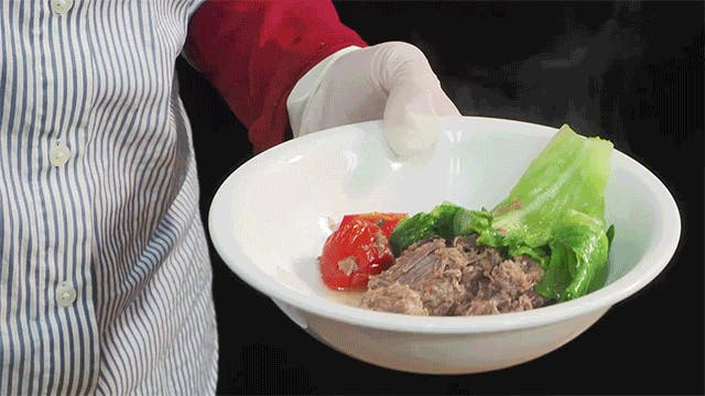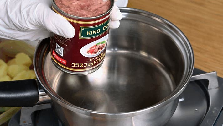 A:缶詰の牛肉はすでにホロホロに煮込んである状態ですので、硬さも臭みも全くと言っていいほどありません。柔らかいお肉は時短で様々なお料理に活用していただけます。