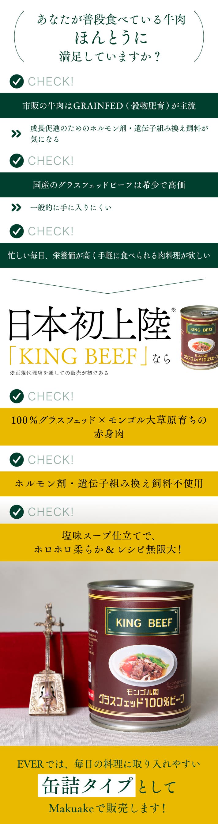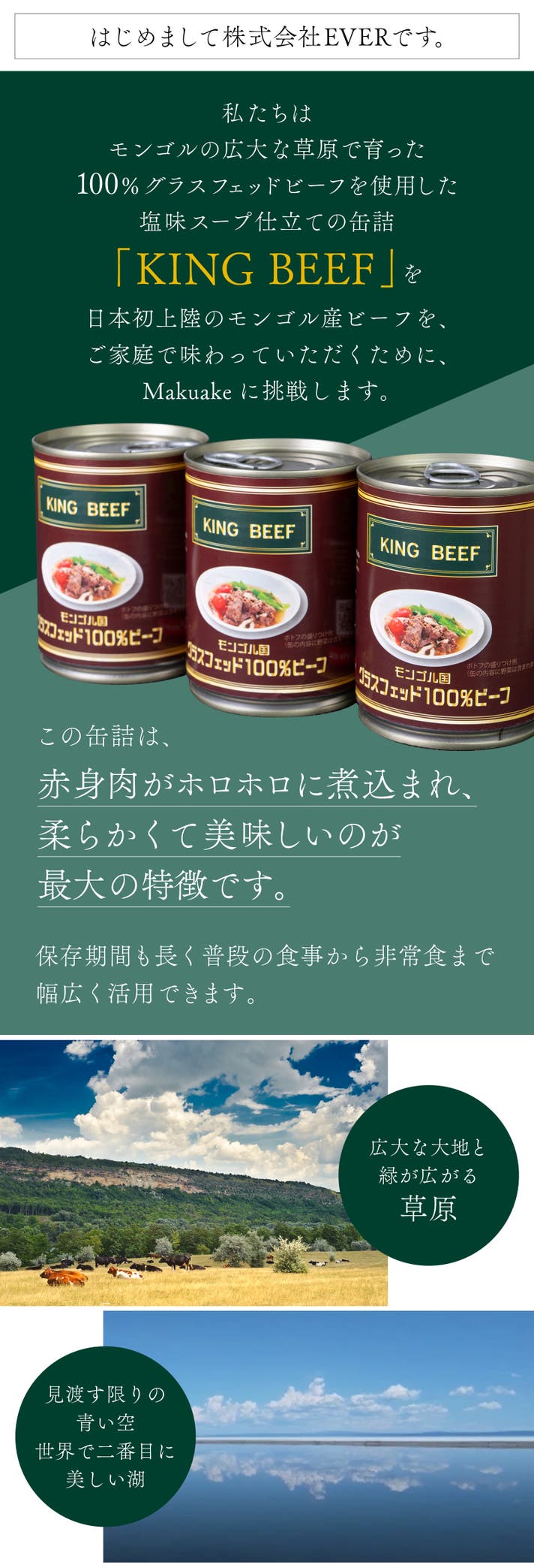 気候変動や環境の変化により、モンゴルの遊牧民の暮らしは年々厳しくなっています。KING BEEFは、モンゴルの遊牧文化を支え、日本の食卓へつなぐ架け橋となる存在。自然のままに育った赤身肉の美味しさを、もっと多くの人に知ってもらいながら、遊牧民の未来をともに守っていきたい——そんな想いが詰まった一缶です。