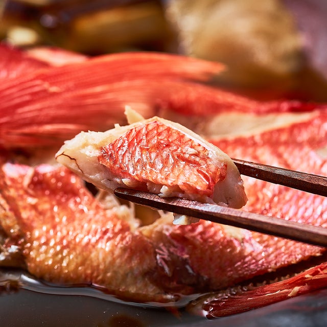 脂が乗った特大サイズの金目鯛の身をほぐして、甘い煮汁にくぐらせて召し上がってください。
