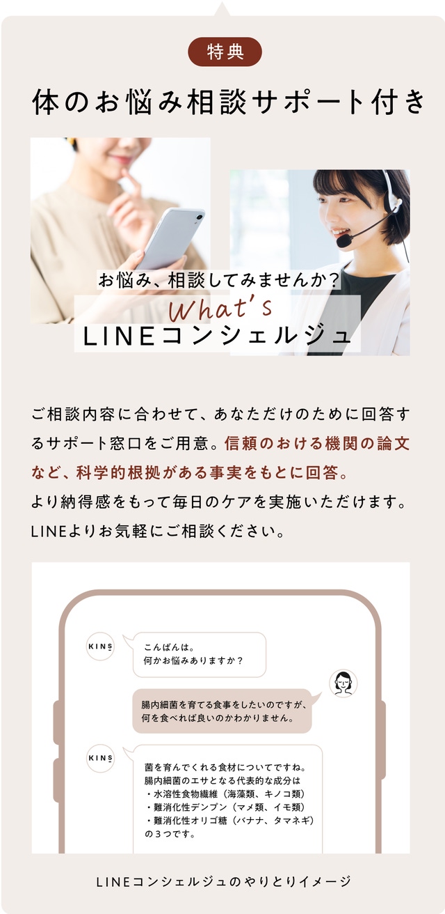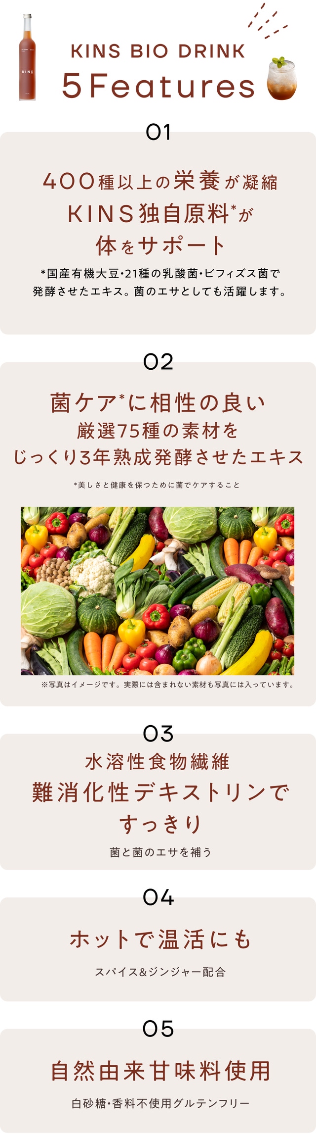 KINS BIO DRINKは、コンシェルジュよる運動や食生活へのアドバイスと合わせてお飲みいただくことで、一人ひとりが菌ケア3箇条をうまく取り入れられるよう、考え抜いた結果生まれたドリンクです。