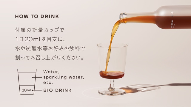A.1日20ml(付属のカップ1杯)を、水や炭酸水などお好みの飲料で割ってお飲みいただくのがおすすめです。毎日お飲みいただいても、ご自身のタイミングでお飲みいただいても構いません。注ぐ前によく振ってからご使用ください。