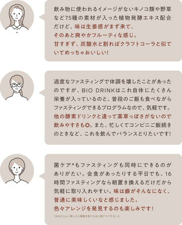 KINS BIO DRINKを使用して16時間ファスティングを行えば、多彩な栄養を凝縮した発酵エキスやKINS独自原料により、菌ケア*も同時にできます。