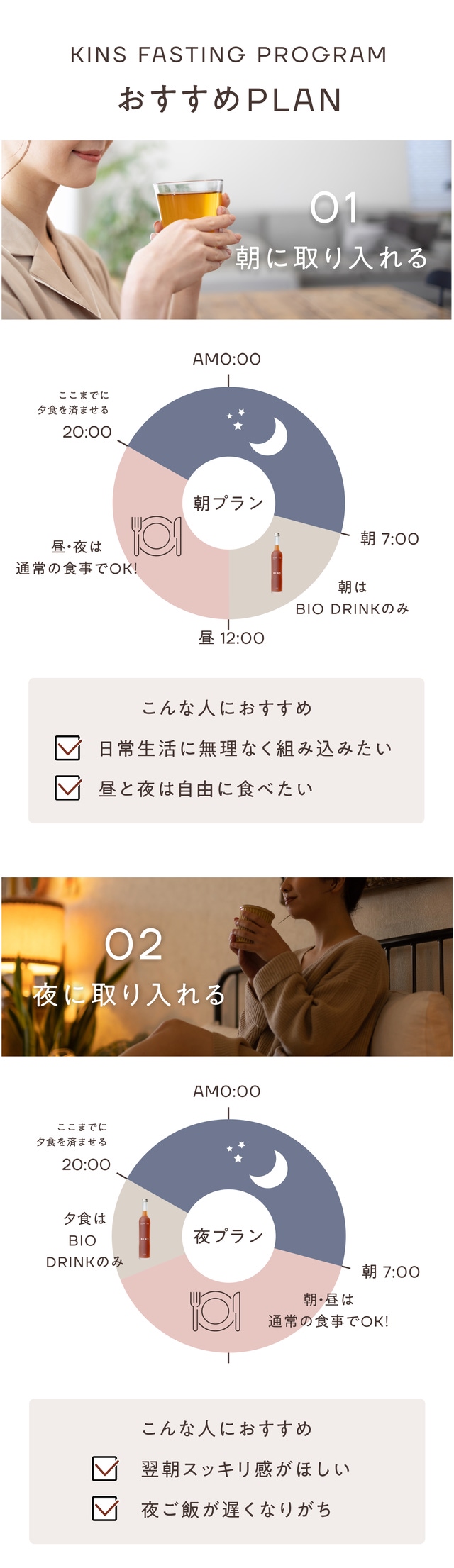 「KINS FASTING PROGRAM」とは、BIO DRINKと、BIO DRINKご購入者さま特典「LINEコンシェルジュサポート」を使用した、16時間ファスティングプログラムのことです。
