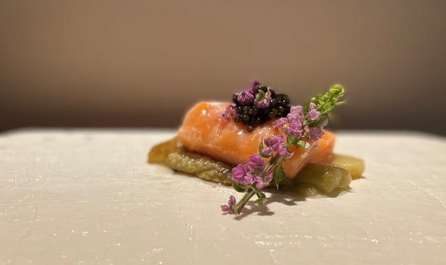 ゆっくりと低温で火入れした秋鮭に旨味を封じ込めて。秋鮭をトロトロに炊くことで、お出汁の旨味を含んだ水茄子の食感と一体感を生み、キャビアの塩気、花紫蘇の香りなど華やかな味わいを感じる事が出来ます。
