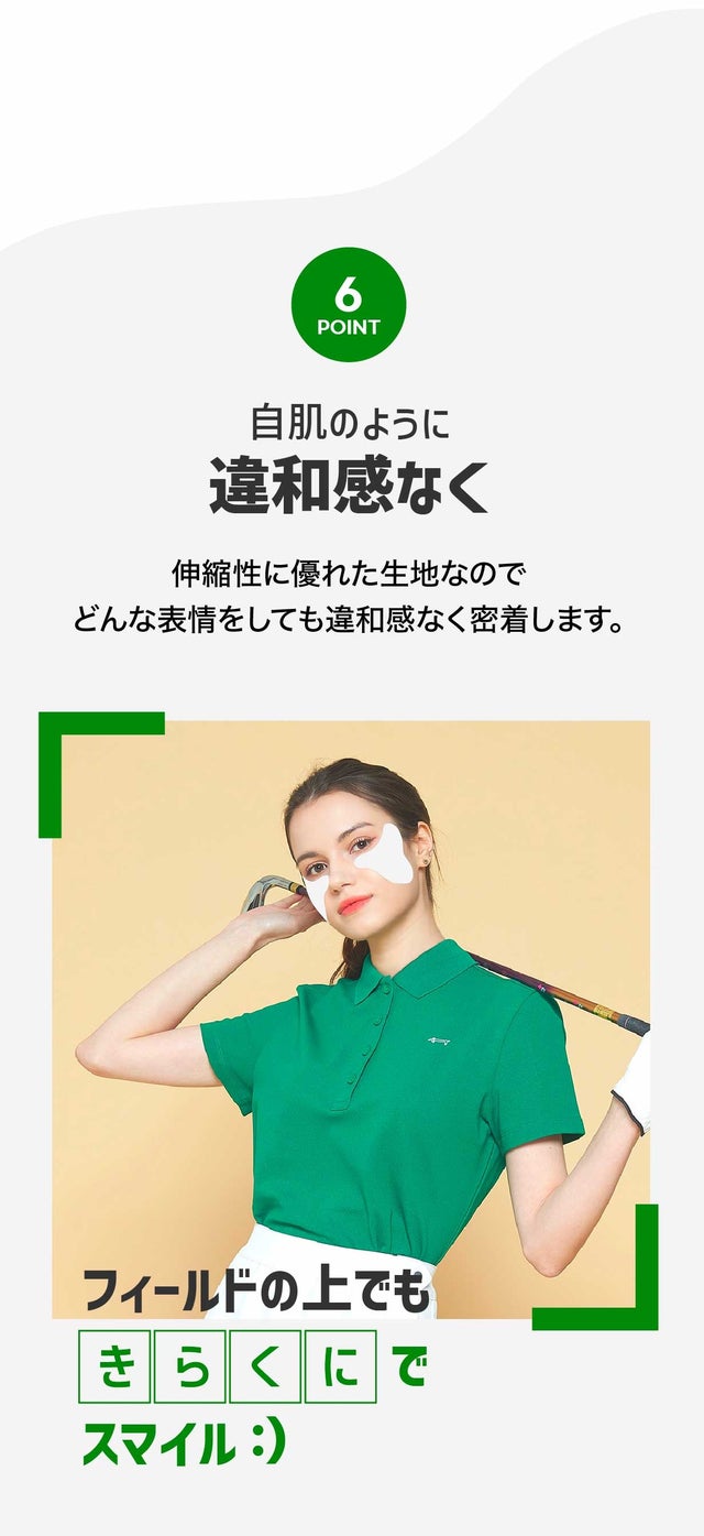 「きらくに」ゴルフパッチはメークや日焼け止めクリームを塗った上から貼るタイプのスキンケアとして紫外線が当たらないようにしっかりカバーします。また、ラウンド中に乾燥対策の保湿成分がお肌にうるおいを与えて明るい印象に導きます。