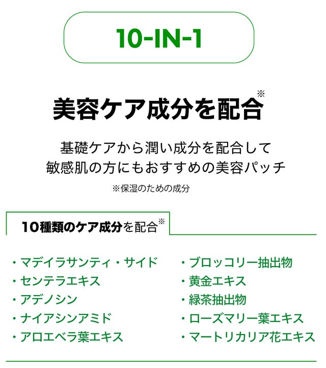 パッチの内側のゲル層に染み込ませた10種類のケア成分は水分や油分を補い保ちながら肌にはりを与えます。お肌にやさしいケア成分なので敏感肌の方もお気軽にご利用できます。