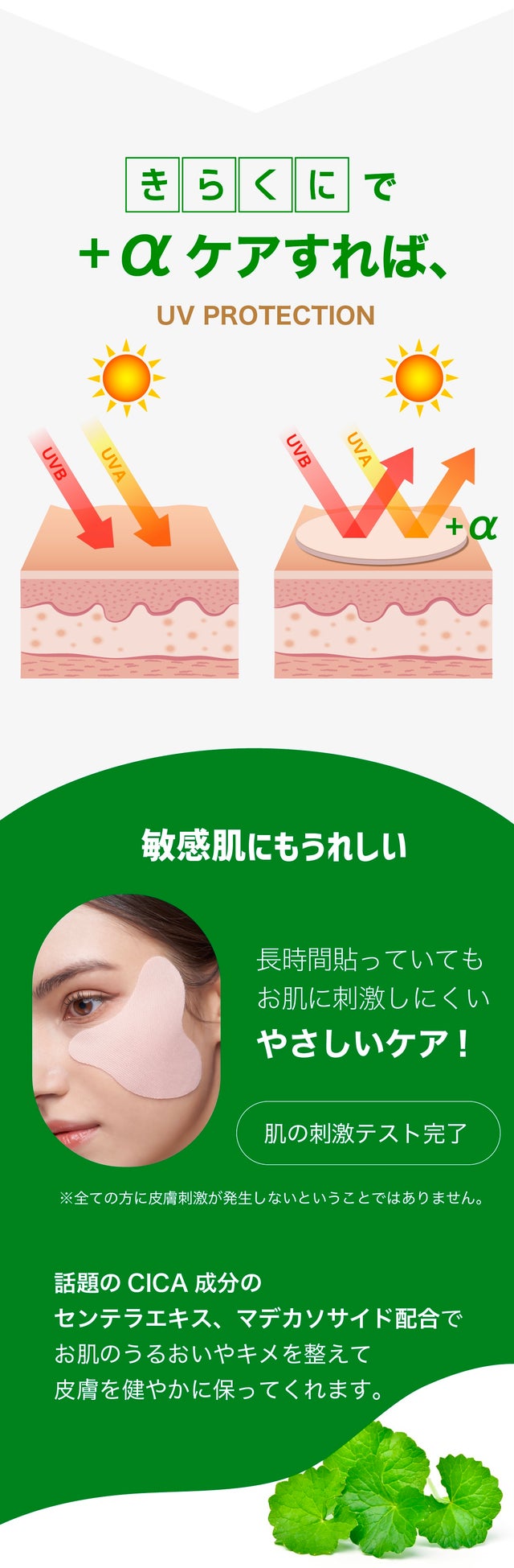 パッチの内側に染み込ませた皮膚にうるおいを与える保湿成分がお肌に吸い付き、日焼けや乾燥からお肌を守ります。