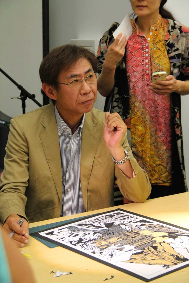 ここでも地元アーティストたちを唸らせたのです。実際に目の前で色紙を切り一つの作品を作ったのです。
