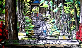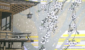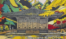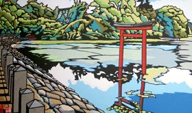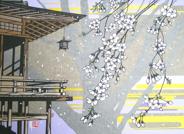 The objects of his art are very traditional Japanese scenery, but he still uses pop and eye-catchy colors and designs. It is a mixture of tradition and pop. That's because he has a background as a commercial designer. He designed some commercial posters for major Japanese companies such as Sanyo Electric Co. and Toray Industries Inc. That experience gave him the idea of mixing Japanese tradition and eye-catchy pop design.