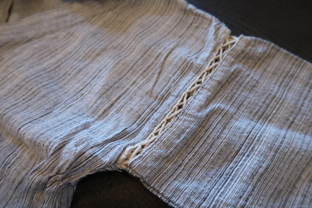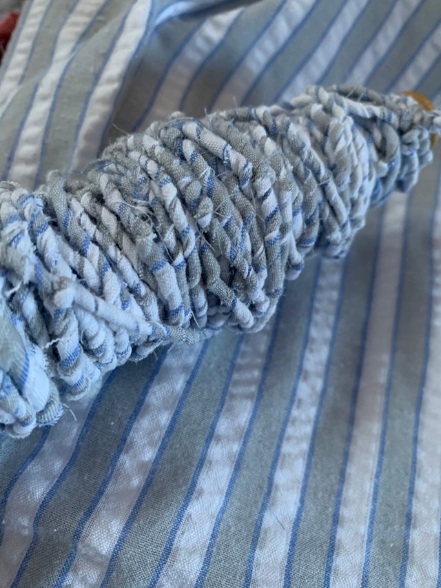 2.お預かりしたパジャマの生地が薄手でしたので、生地を裂いて撚りをかけました。