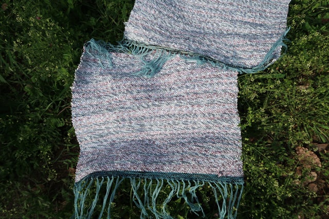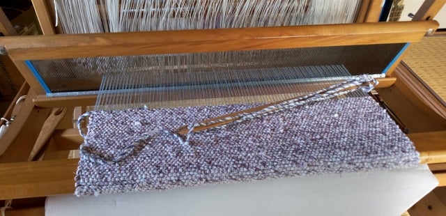 6.緯糸は撚りをかけた、裂いたパジャマ生地を3種織り込んでいきました。