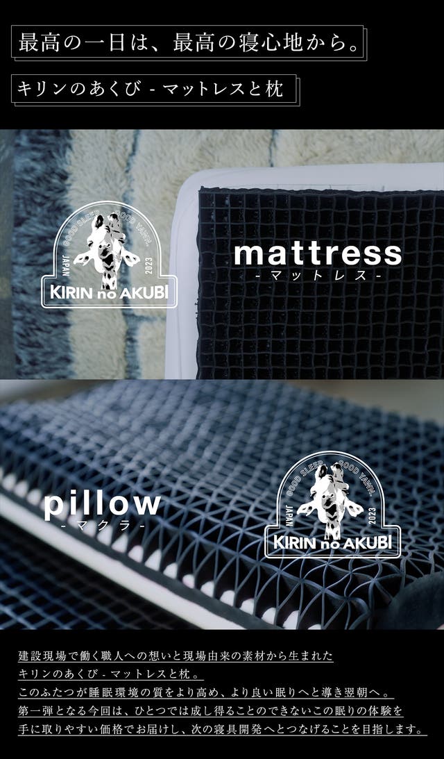「Makuake(マクアケ)」は、実行者の想いを応援購入によって実現するアタラシイものやサービスのプラットフォームです。このページは、 プロダクトカテゴリの 「【職人を支える寝具】建設現場の声から生まれた「キリンのあくび-マットレスと枕」」プロジェクト詳細ページです。