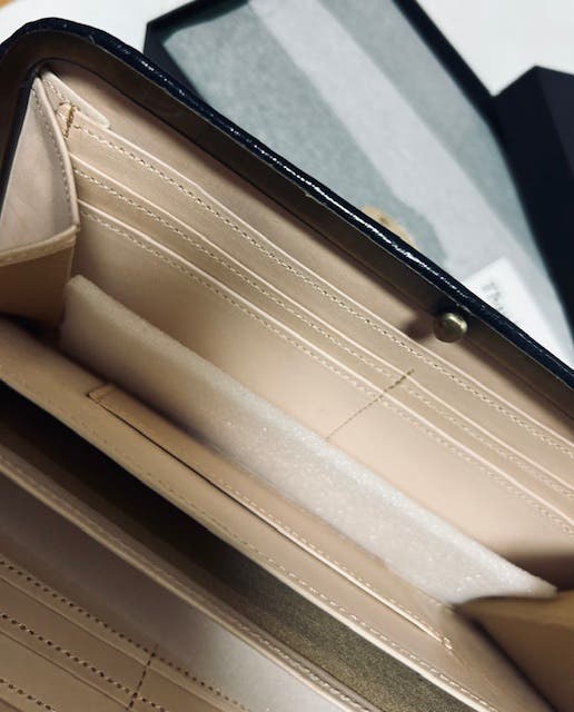 長財布といえば二つ折りのものやファスナーで開け閉めする厚みのある大振り財布が多い中、ガマグチの財布は珍しく作る工程は専門の職人でないとできません。