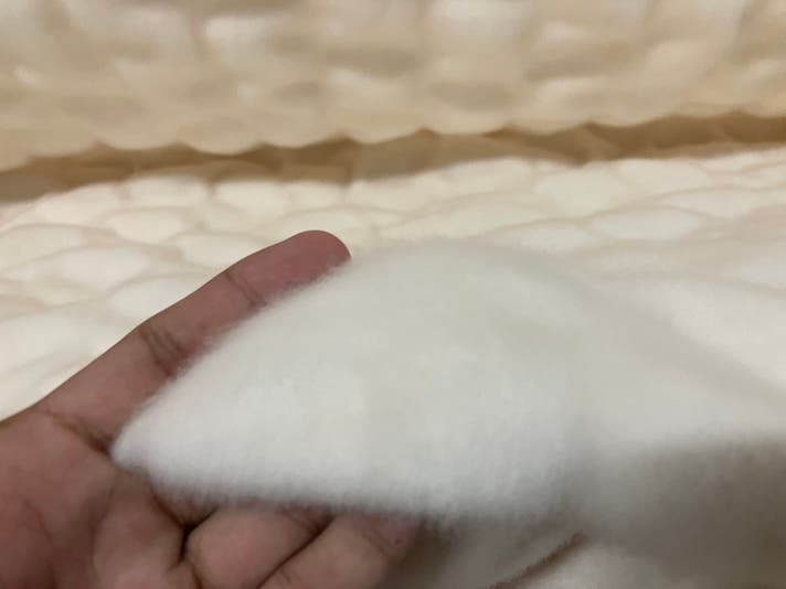 自然素材ならでは、綿のやさしいタッチ感。片面がパイル状になっているので軽いのにボリューム感のある生地に。