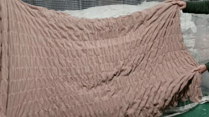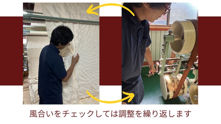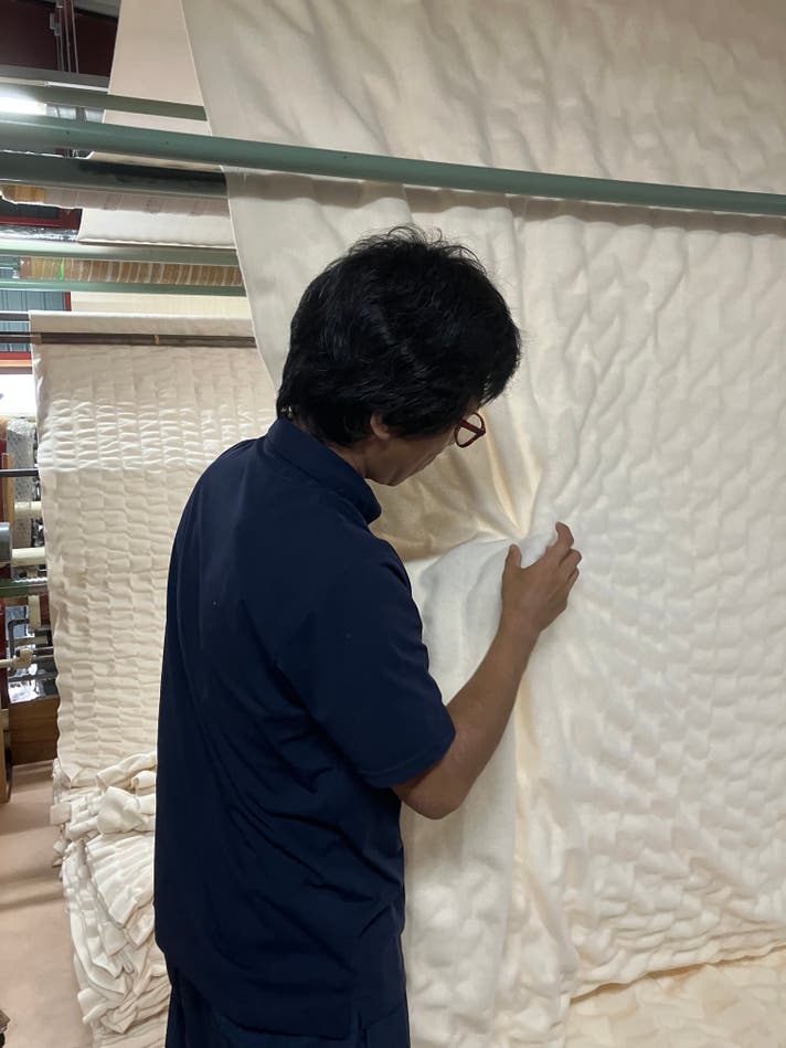 所属する有限会社島本化繊起毛工場では、これまでさまざまな素材や生地に起毛加工を行ってきました。その中でも、このブランケットの起毛工程を把握しているのは私だけ。糸の特性や生地の表情を見極めながら、生地に合わせてメートル単位で微調整を行い、“のびふわ”ならではのやわらかな肌ざわりを仕上げています。