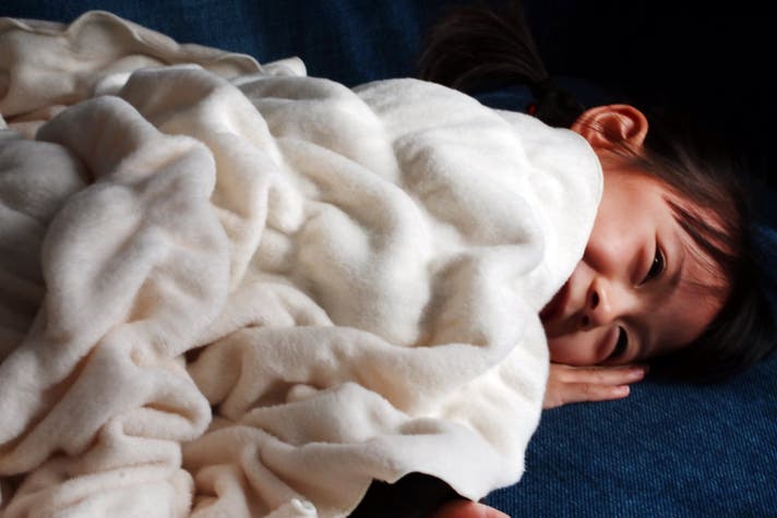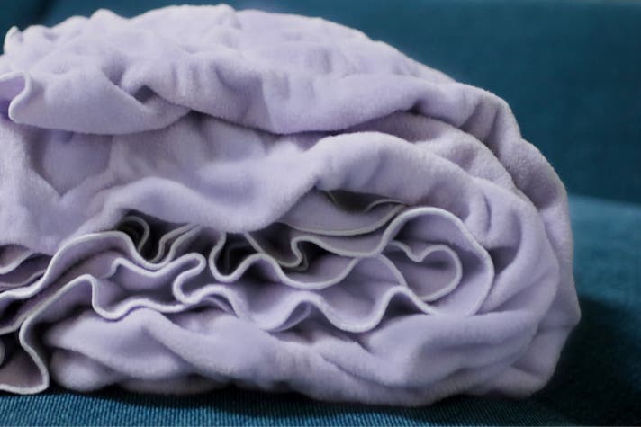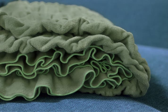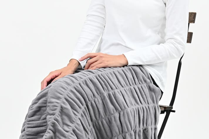 ドレープ性のある編み生地を採用。肩までかけても、くるまっても突っ張らない。まるで空気をまとうような軽やかさ。また、縮んできたヒダヒダは、自分の体温で温まった空気がたまる構造になっています。