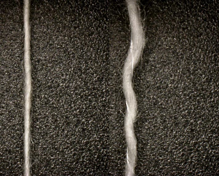 撚り戻しのための極細の糸は、綿の毛羽の脱落を軽減する効果もあります。なので、使い始めの毛羽落ちが大幅に軽減されました。