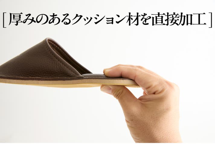 約1cmの厚みのあるクッション材を靴そのものに設置加工するのは、至難の業でした。何人ものベテラン職人たちが知恵を出し合い、ここに極上のクッション性を兼ね備えたルームシューズが出来上がったのです。