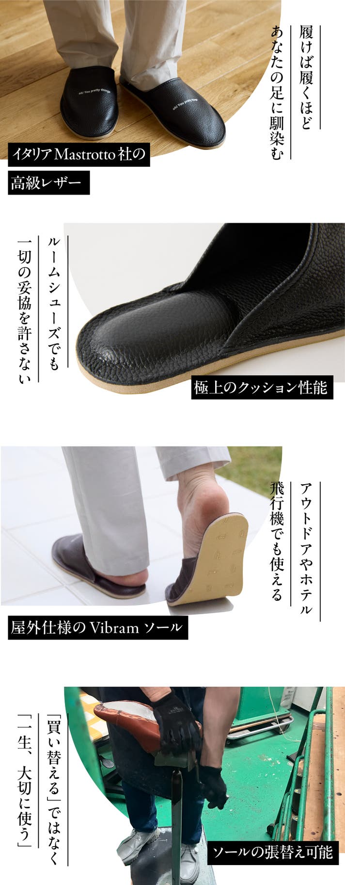 日常から「本物の心地良さ」を体感していただくのはもちろん、革を自分仕様に育ててゆく喜びもお愉しみいただけます。ソールのリペアにも対応しているので、あなた仕様のルームシューズを直しながら一生使い続けることも可能。サステナブルな社会貢献にもつながることでしょう。