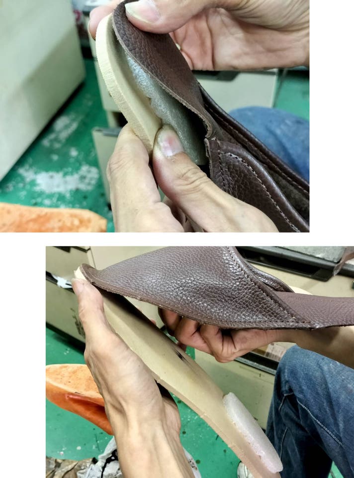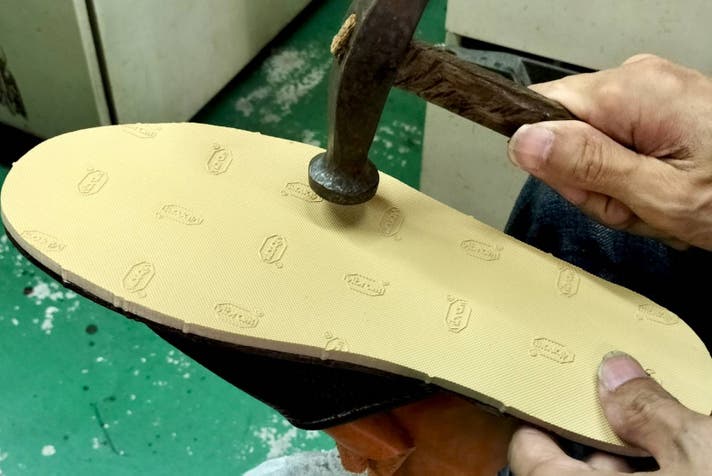 クッションに厚みがあるためソール部分も膨らんでしまうので、圧着機でプレス作業前に、接着を良くするためハンバーで叩いて平らに整えます。