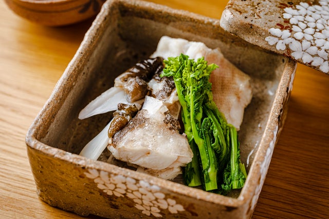 コースの種類によって煮物の種類は変わりますが、尾や頭、中骨の周りなど、骨とともに蒸すことでより一層出汁のうまみが広がる「骨蒸し」や、希少なかまの部分などをたっぷりの野菜と一緒に蒸し上げる「身酒蒸し」は、しみじみとクエの旨味を楽しめる逸品。