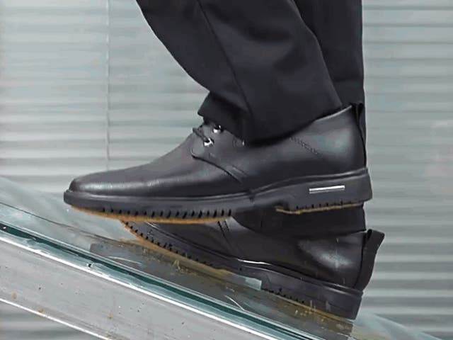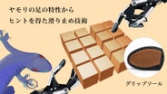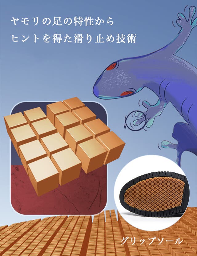 独自に開発された特殊なアウトソール素材とヤモリのバイオミメティクス(生物の構造や機能を工学的に模倣した技術)により、水や油で滑りやすい環境でも安定した歩行をサポートします。