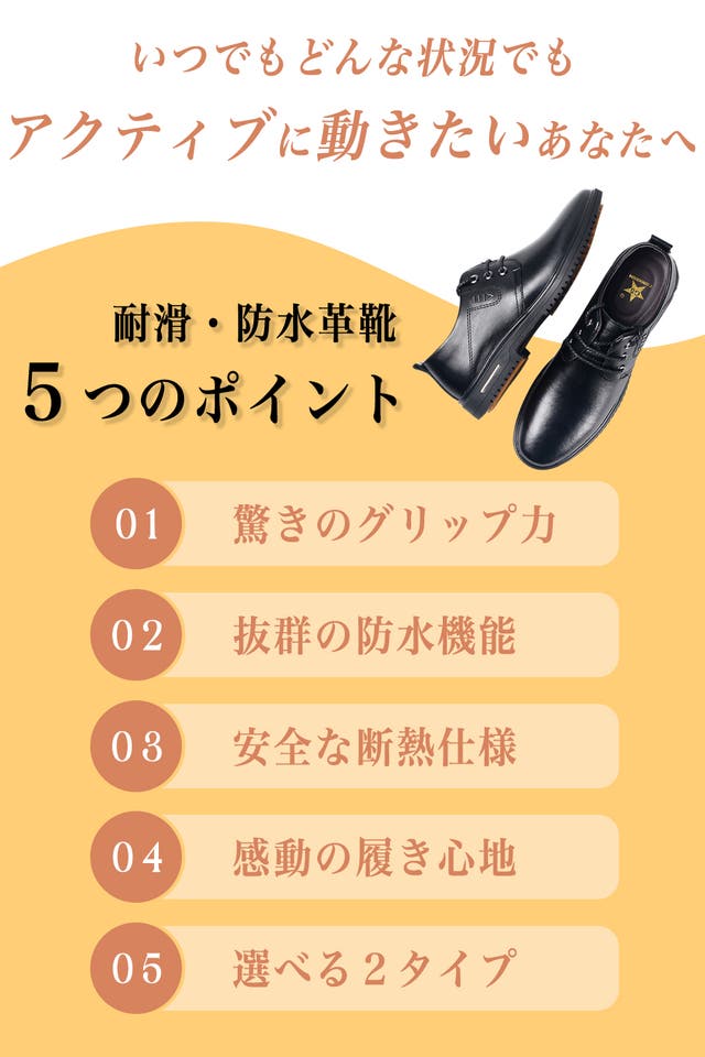 「耐滑・防水革靴」は、そのような状況でも自信を持って歩けるように設計されています。