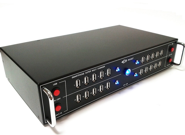 今頃のスマート機器は高速充電対応のため1.7〜3.6Aで充電を行います。よって20台を同時充電には17A〜約60Aの大容量の充電出力が必要になります。