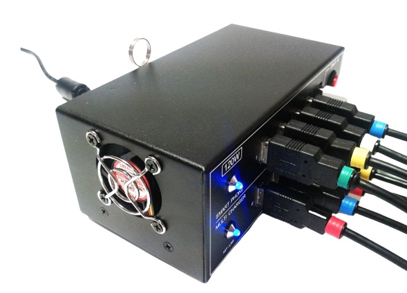 高速充電対応スマート機器の同時充電時初期の大量の電流供給により充電機器内部のPCB基盤からはかなりの熱が発生します。このためPCB基盤内部に小型放熱板を8枚及びさらに速やかな放熱のため40パイの冷却ファンを使用しております。同時に外部の冷たい空気を吸い込むため専用の通気口もあり熱の問題による充電効率の低下の問題をクリアしております。