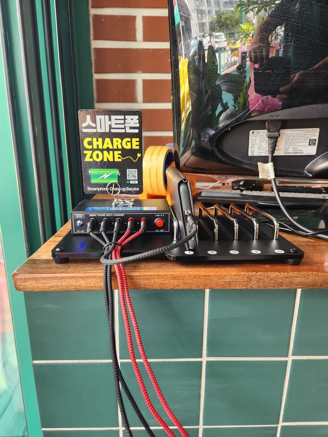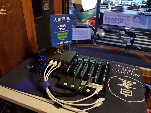 製造国の韓国では専用ステッカーを店の前に貼ってある飲食店が急激に増えております。内容を直訳しますと”スマホ充電してください”です。新しい概念の顧客サービスです。