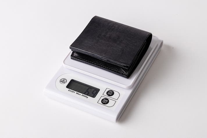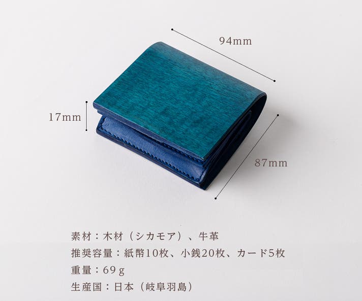 財布本体わずか69g。一般的な二つ折り財布は150g前後。木材だからこそ成せる軽さです。