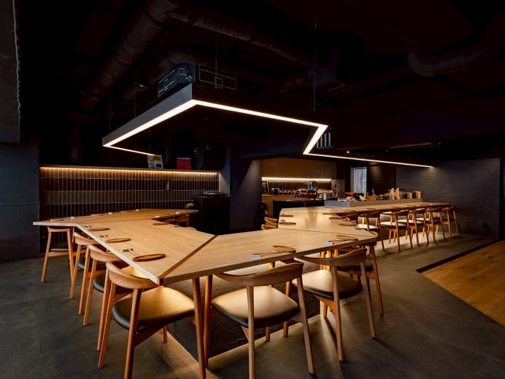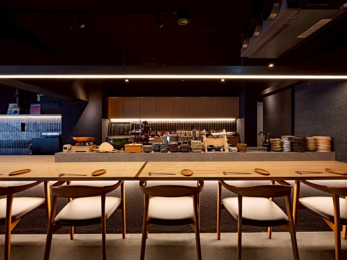 扉の向こうにはライブ感あふれる美食の空間。和モダンな雰囲気は背伸びしたデートにも
