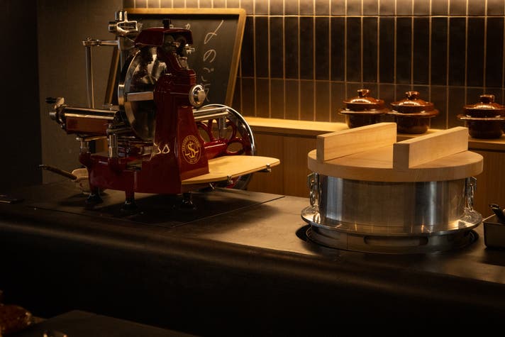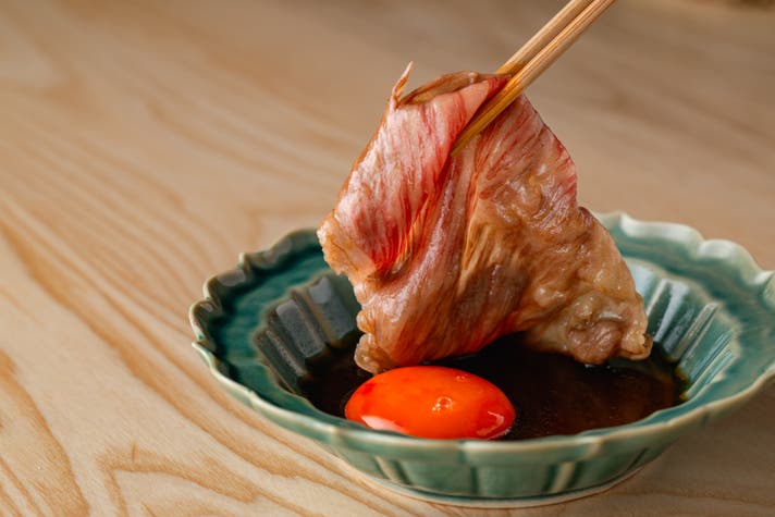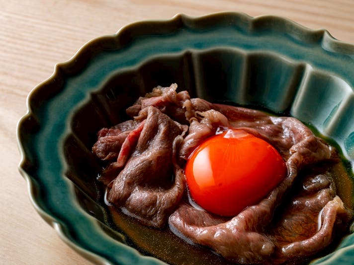 料理の内容にも工夫をこらし、開店以来早くもシグネチャーとして人気を集める「すき焼割烹日山の黒毛和牛すき焼卵黄添え」や「牛カツサンド」のほかに、〆料理は5種類からお選びいただきます。