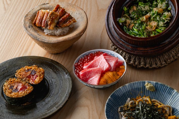 そして、〆のお食事は、中トロ、赤身、ヅケ、トロの炙りの鉄火巻き、カラスミそば、北海道産つぶ貝と九条ネギの炊き込みご飯、鰻丼、海鮮丼の5種類を用意。