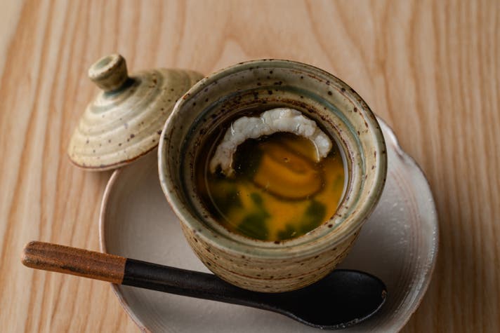 山形県産鱧を使った茶碗蒸しは、日本橋室町の鰹節専門店「にんべん」の鰹節を贅沢に使用しています。