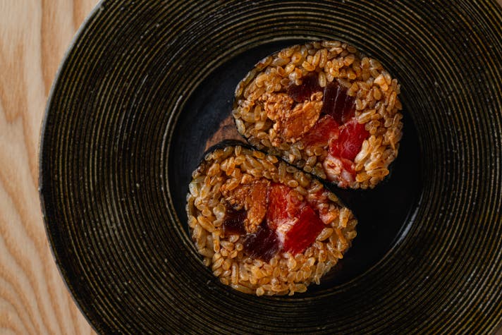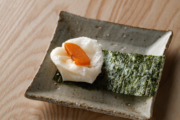 鉄火巻きには、カラスミもちと同じく金子海苔店の海苔を使い、シャリには千葉にあるヒサイチ醸造の赤酢を使用しています。