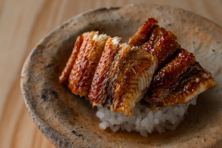鰻丼は、愛知の鰻問屋から仕入れる鰻を関西風に焼き上げます。